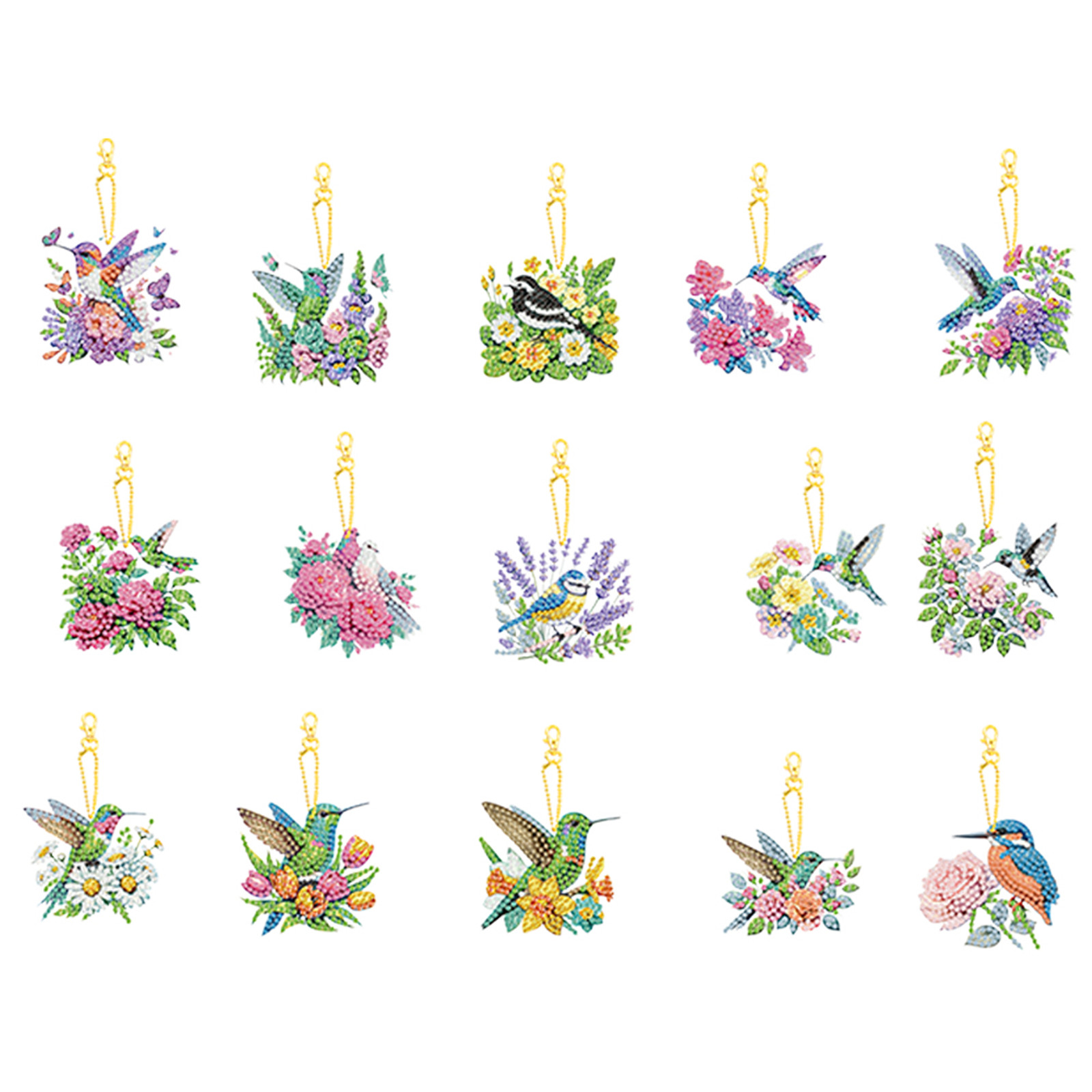 15Pcs Flowers Birds DIY Double Sided Diamond Painting Keychain Kits for Adults