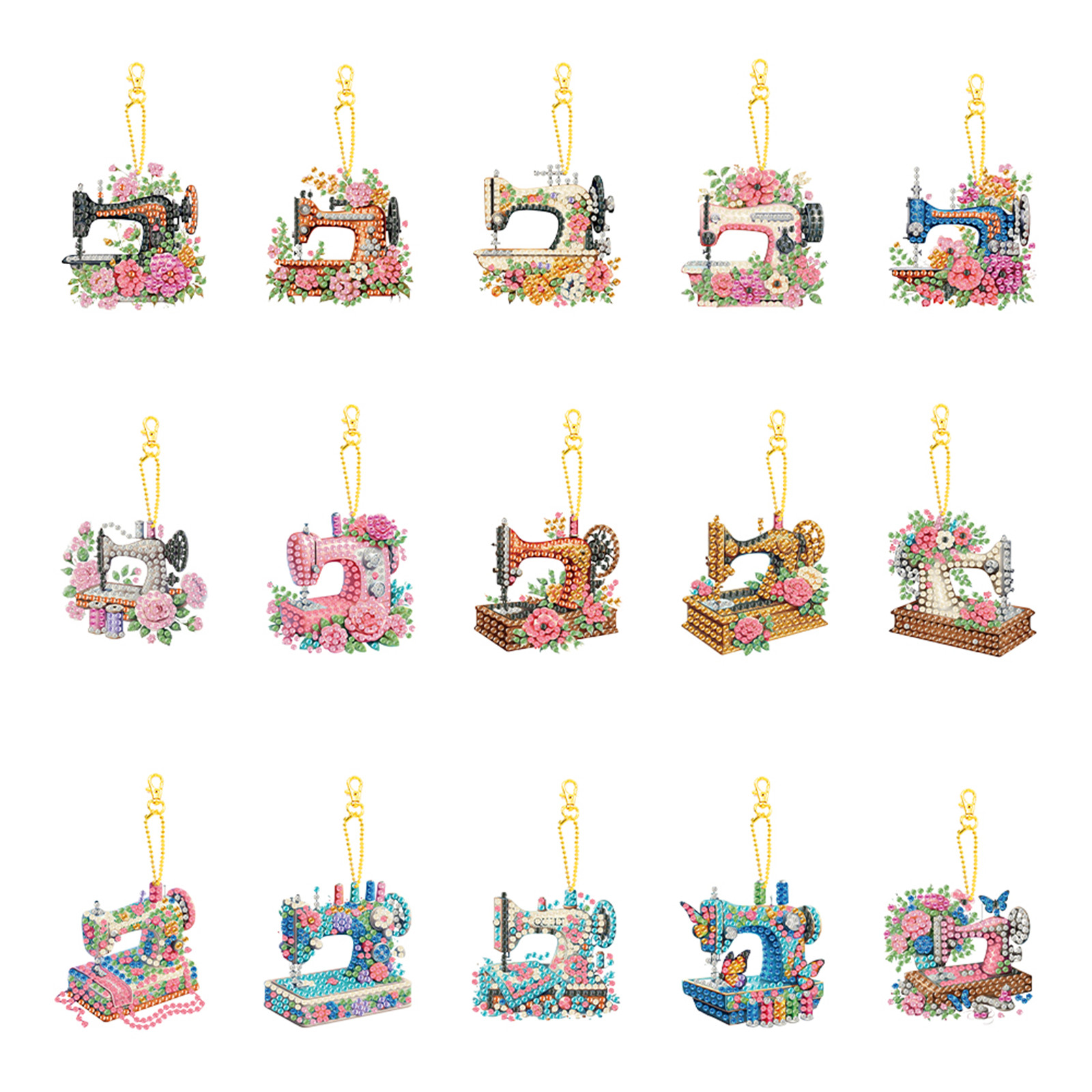 15Pcs Sewing Machine DIY Double Sided Diamond Painting Keychain Kits for Adults