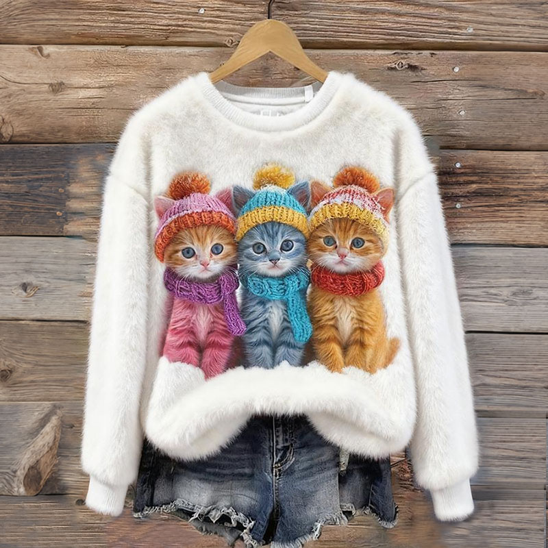 Cute Christmas Hat With Cat Pattern Thick Pullover Sweater