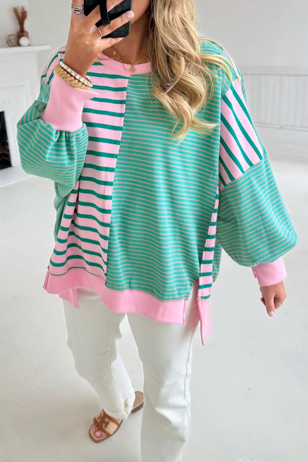Green Stripe Colorblock Patchwork Side Split Sweatshirt