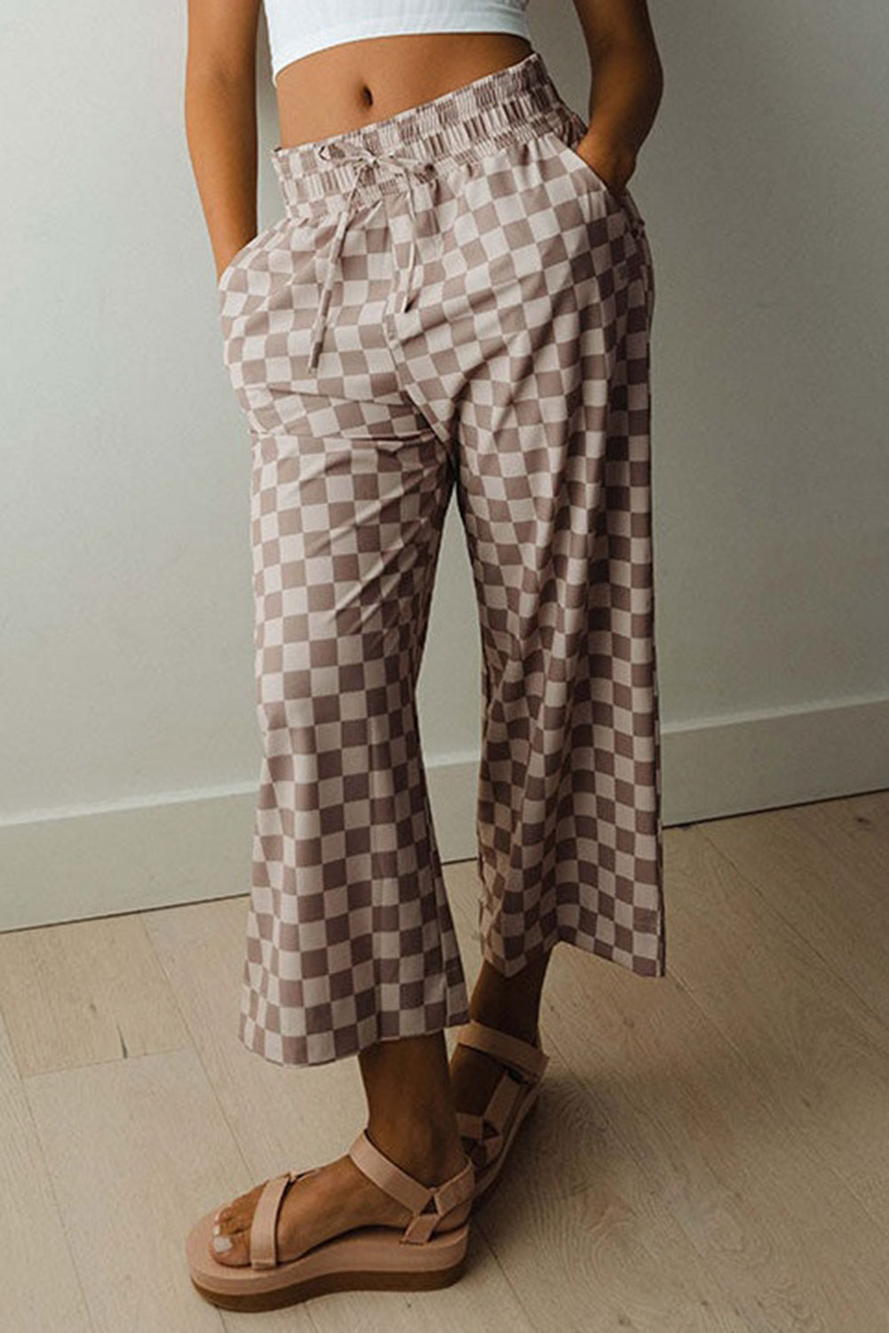 Khaki Tie Elastic Waist Checkered Loose Pants