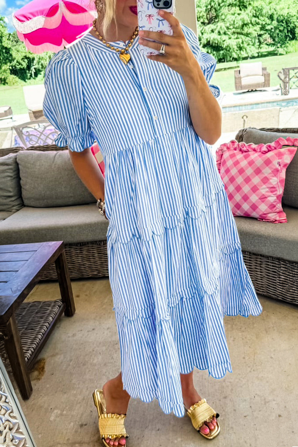 Sky Blue Stripe Bubble Sleeve Scallop Tiered Dress