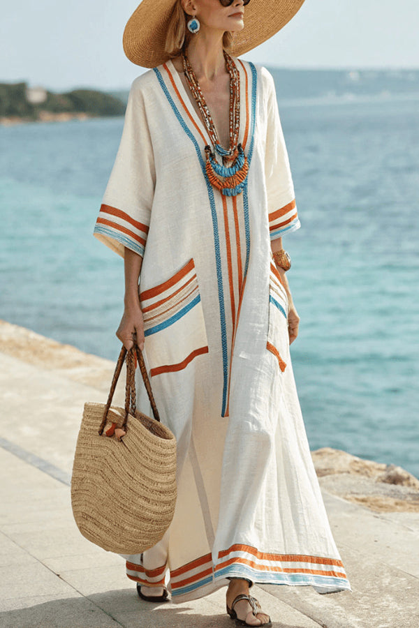 Striped Print V-Neck Casual Loose Pocket Maxi Dress