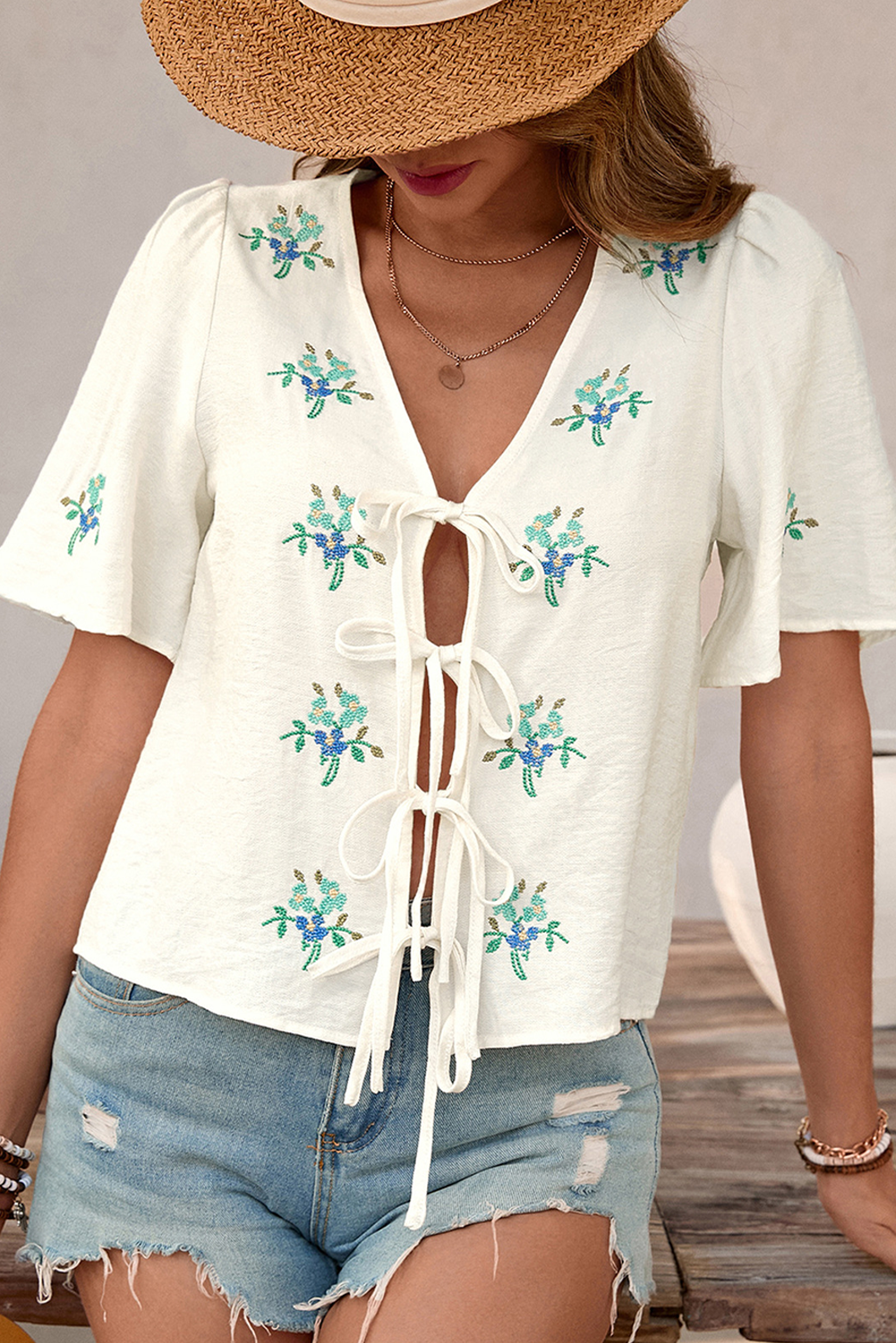 White Floral Front Bow Tie Blouse