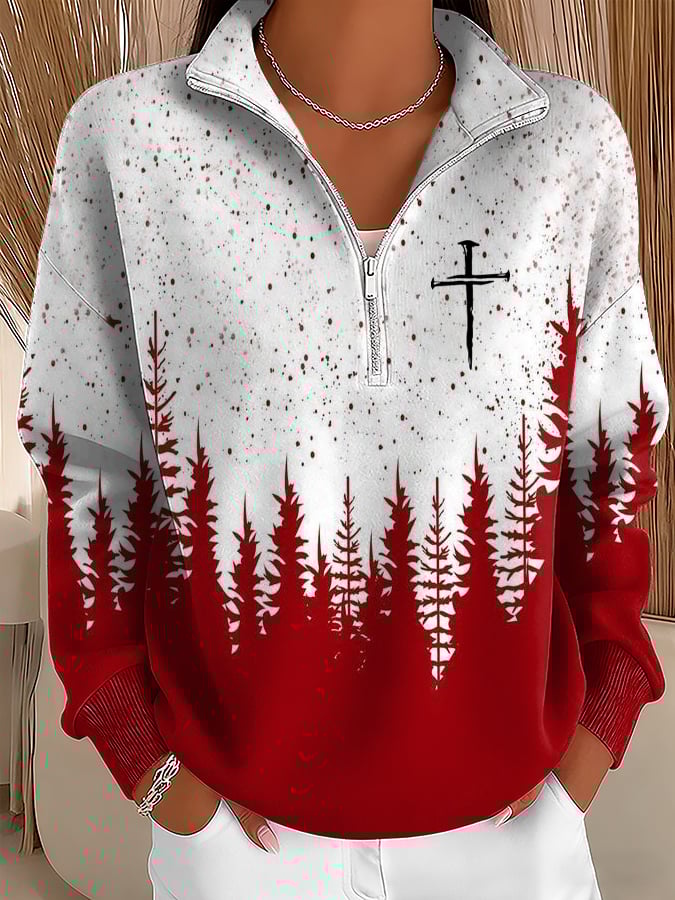 Women's Christmas Cross Print Zipper Stand Collar Sweatshirt