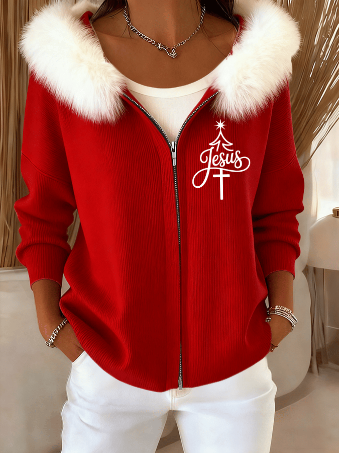 Women's Christmas Faith Plush Zipper Casual Hooded Sweatshirt