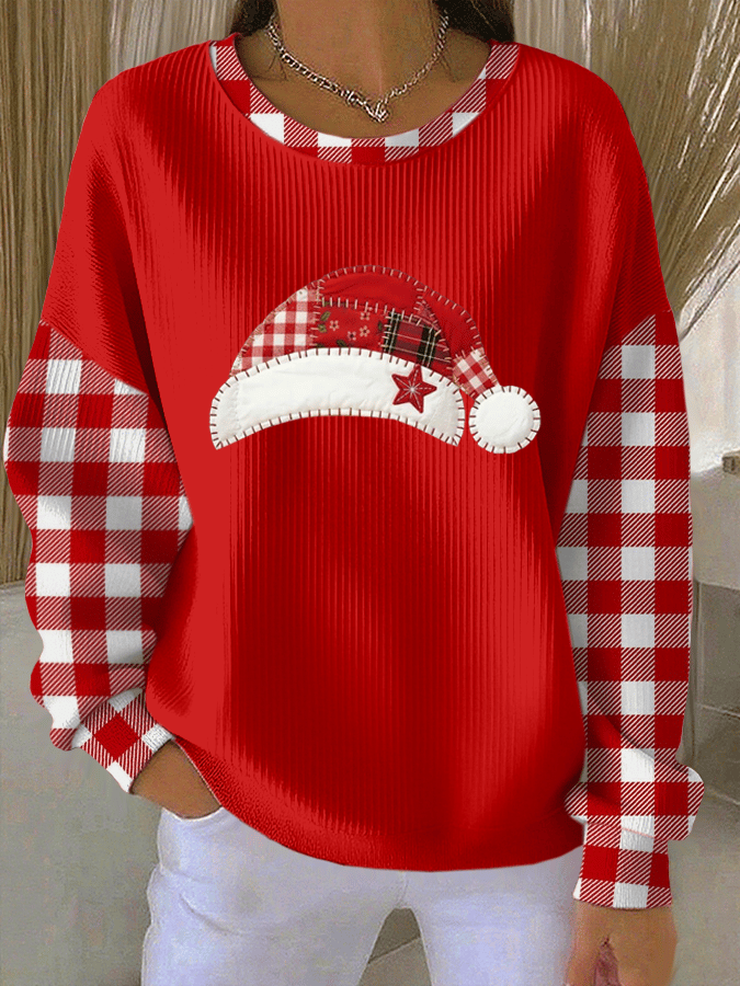 Women's Christmas Hat Print Knitted Crew Neck Long Sleeve Top