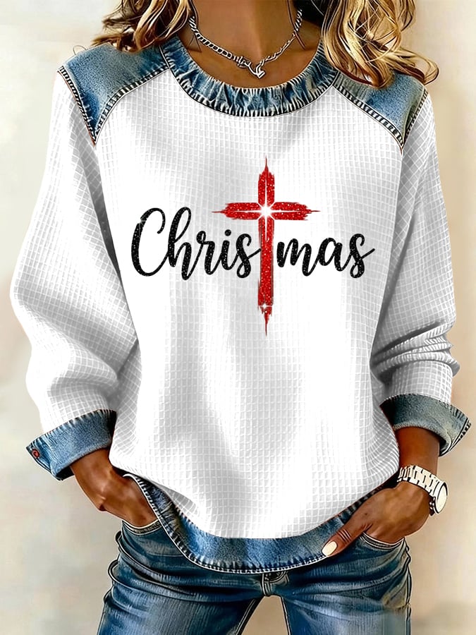 Women's Christmas Waffle Crew Neck Casual Sweatshirt