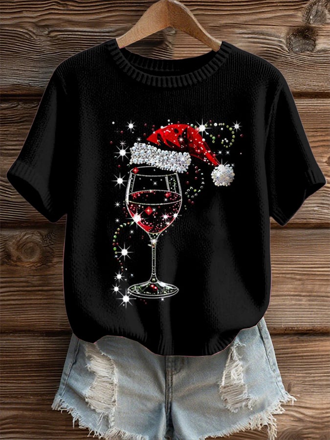 Women'S Christmas Wine Glass Print Short-Sleeved T-Shirt
