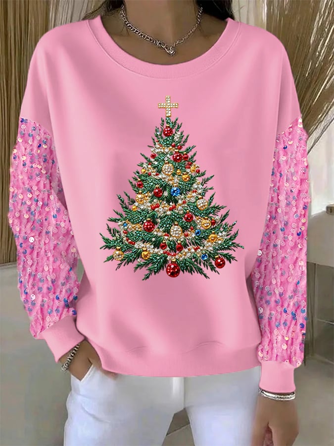 Women's Cross Christmas Tree Sequin Sleeve Casual Sweatshirt
