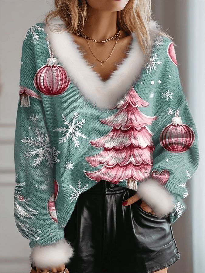 Women's Retro Christmas Tree Pattern Print Fur Collar Paneled Knit Top