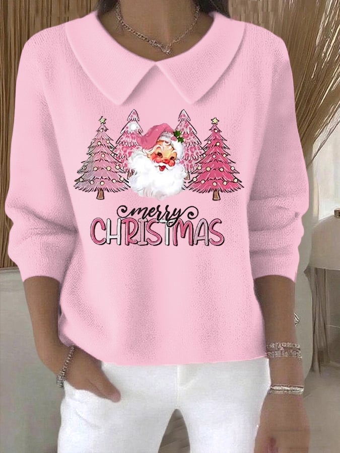 Women's Retro Merry Christmas Print Casual Lapel Knit Top