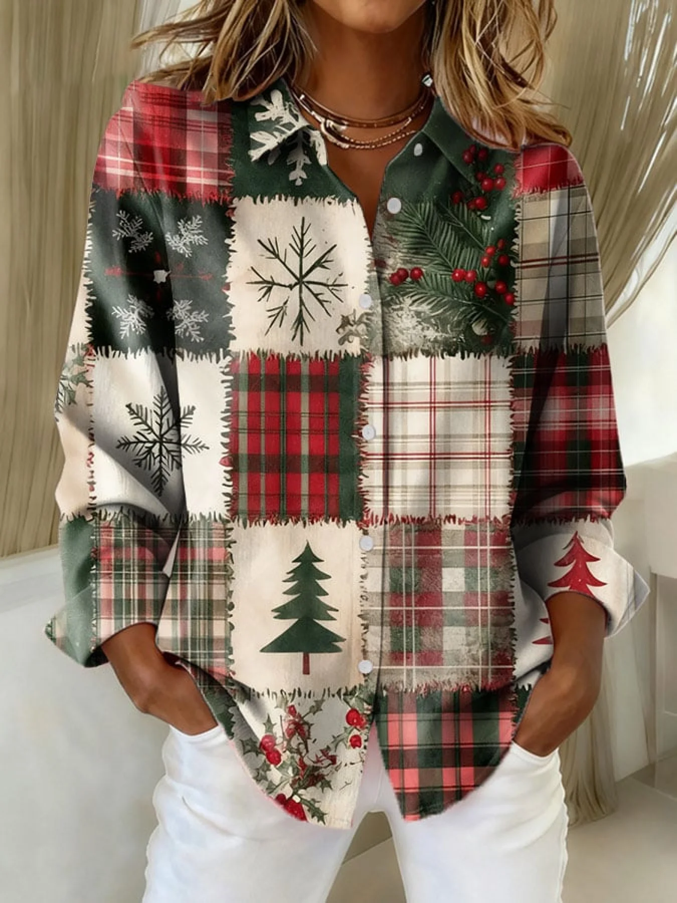 Women's Vintage Christmas Patchwork Art Print Casual Cotton Shirt